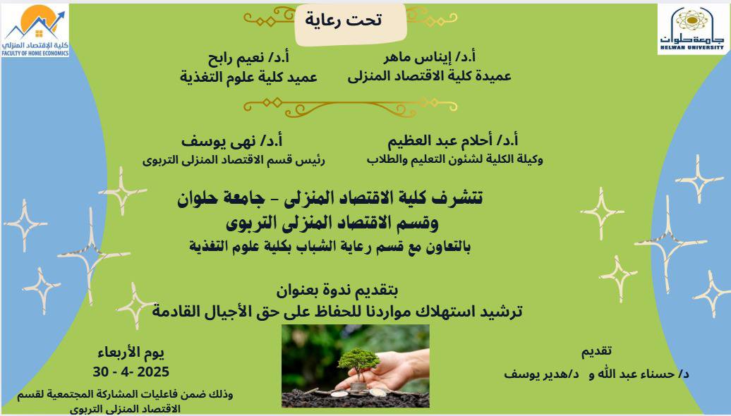 Under the patronage of Prof. Dr. Naeem Mohamed Rabeh, Dean of the Faculty, and the supervision of the Youth Welfare Department (Ms. Rehab Abdel Aal), a seminar entitled “Rationalizing Resource Consumption” was held on Wednesday, April 30, 2025, at the Faculty of Nutrition Science.