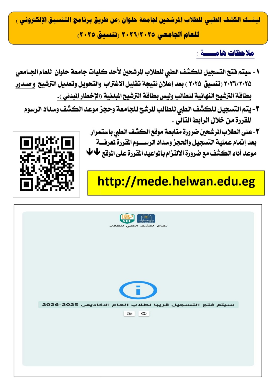لينك حجز الكشف الطبي - للطلاب المرشحين لأحد كليات جامعة حلوان الحكومية - للعام الجامعي 2025-2026