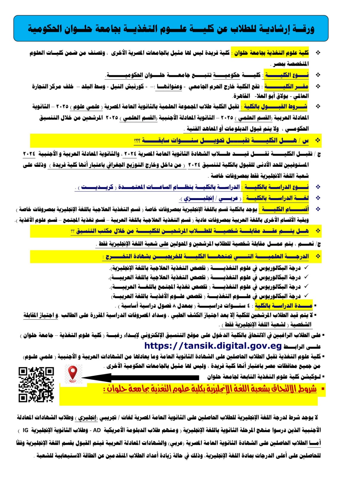 ارشادات الالتحاق بكلية علوم التغذية والكشف الطبي