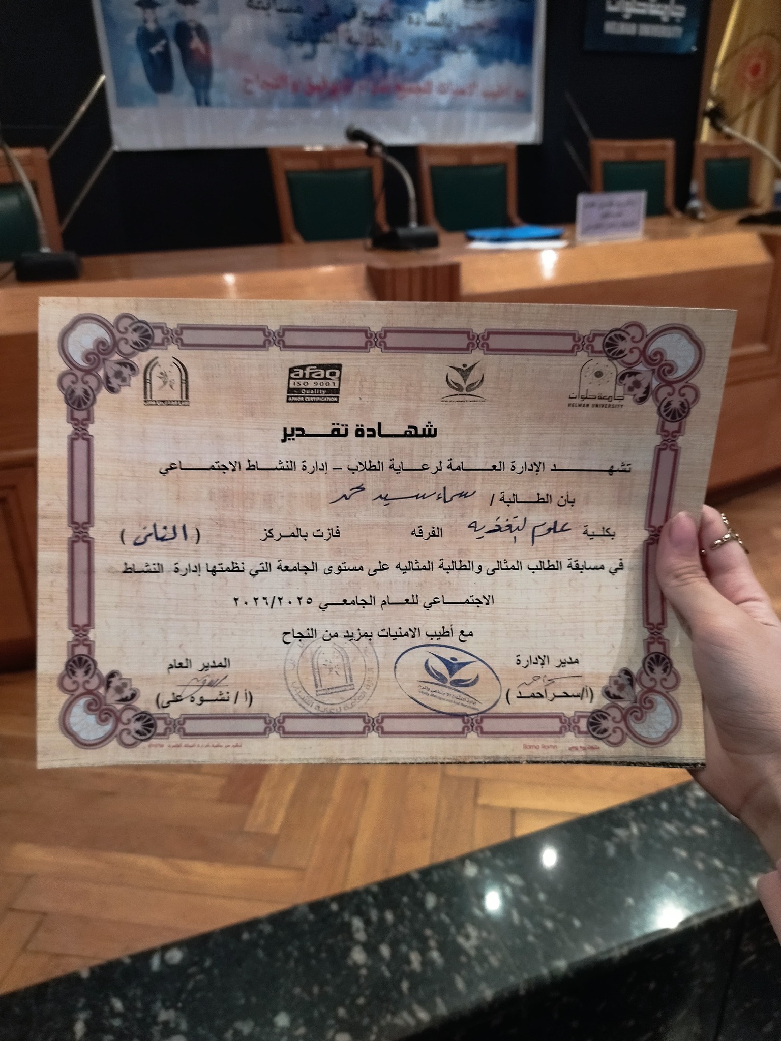 لحصولها علي المركز الثاني علي مستوي الجامعة